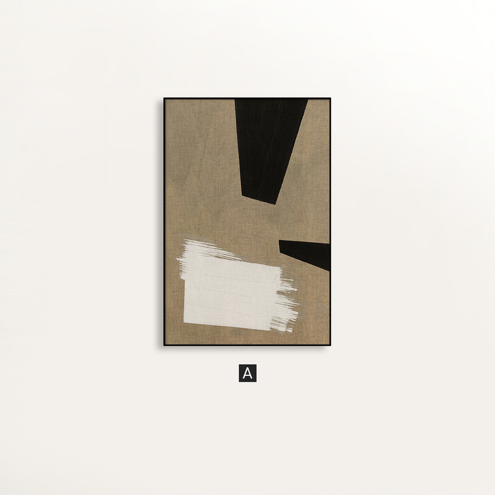 "Abstract Intersection" is a striking minimalist artwork featuring bold black geometric shapes juxtaposed against a textured beige background with a central white accent. The sharp contrasts and dynamic composition create a sense of movement and depth, evoking a modern, sophisticated aesthetic. Perfect for contemporary interiors, this piece adds a touch of bold elegance and artistic refinement to any living or workspace. Its simplicity and balance make it a timeless addition to your art collection.